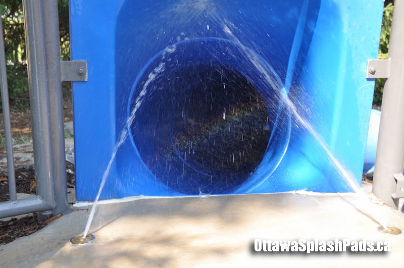 In case you’re wondering, the City of Ottawa splash pad hours are usually between 9AM to 9PM according to their website. Today (Sunday), there was a city employee who opened up the bathroom and turned on the lower level water park at 8AM. I imagine the upper level was on a timer and turned at 9AM. When we came back a two hours later, the place was already packed, but we were able to grab a quick snap of the water slide with the water turned on.