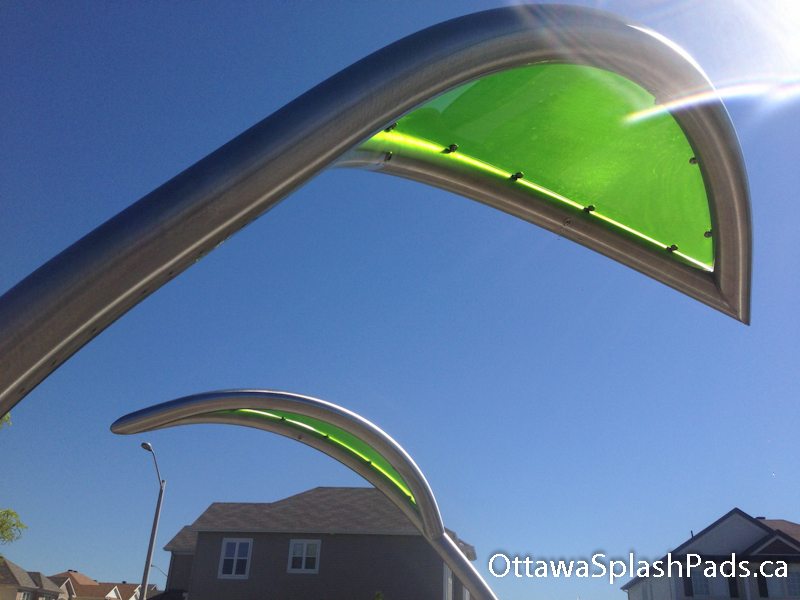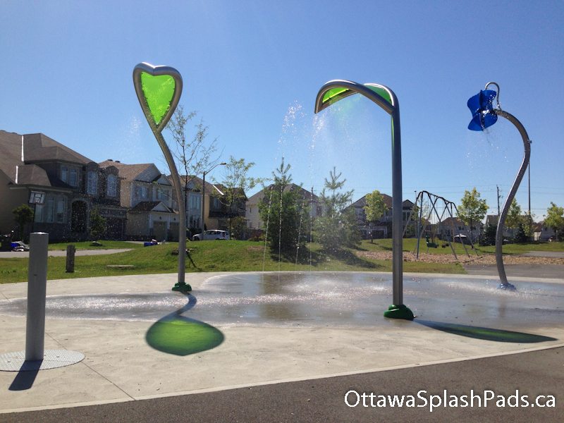 Bradley Ridge Splash Pad is a brand new splash pad that isn’t on the City of Ottawa splash pad list yet (at the time of visiting). It has some fancy structures – two leafs and a spinning flower – but it’s a fairly basic pad. When the start button is pressed all the structures spray at the same time.