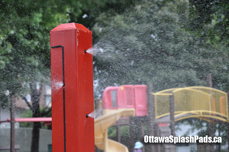 Elmridge Park Splash Pad is an older wooden post pad. There are four posts at the pad, each with it’s own start button.