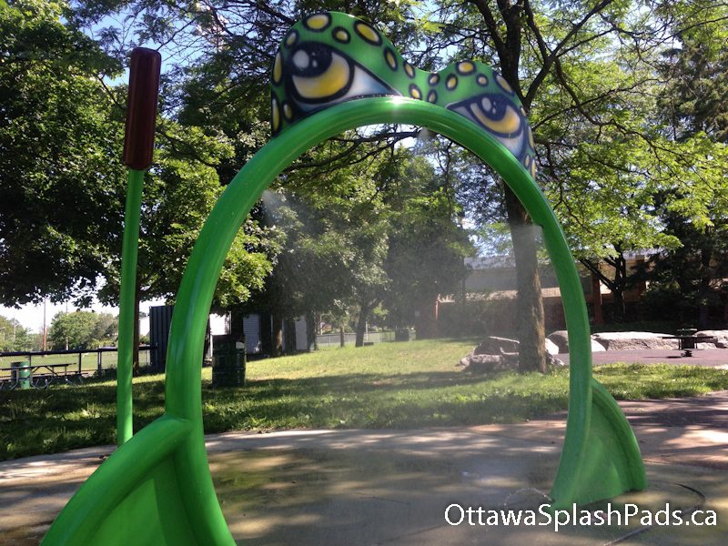 A novel themed splash pad. The pad is shaped like a lily pad. The structures at the park include a froggy archway and a cattail post. This one was our daughter’s favourite of the day – it’s a nice splash pad for more hesitant splashers. The pressure is gentle and there is nothing unpredictable or that can be targeted at others.