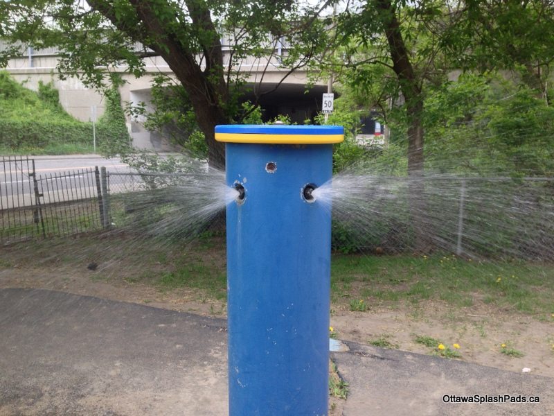 An older splash pad with one blue post. Just a little water park and play structure beside the Old Town Hall community center below the highway.