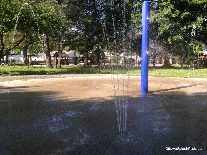 The splash pad at Queenswood Heights Centennial Park Splash is nice. There are two separate water play areas separated by some picnic tables under some tall trees.